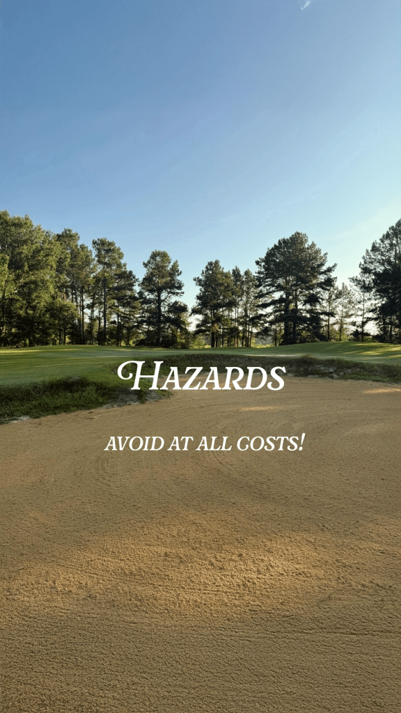 The Hazards. The term “hazards” refers to bunkers, trees, bodies of water, etc. These are places you want to completely avoid as it can be extremely difficult to get your ball out of, if at all even possible.
