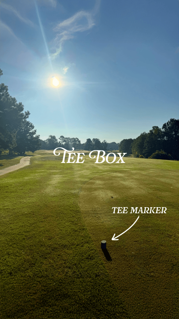 The Tee Box. Also known as “the tee” and where you “tee off”. Each of the 18 holes has its own tee box. The tee is where each hole begins. A golfer will set up their tee and place their ball on top. Take a practice swing, then complete a real swing. Each tee box has at least three different markers that you can start from depending on your skill level. The tee markers furthest up are generally for women and beginners. The further back you go, the higher the skill level.